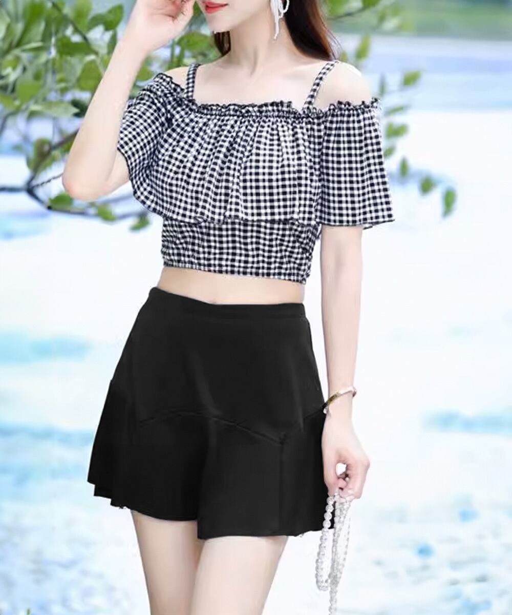 ギンガムチェック セパレート水着 レディース 露出控えめ ハイウエスト パンツ付きミニスカート 2点セット水着大人可愛い